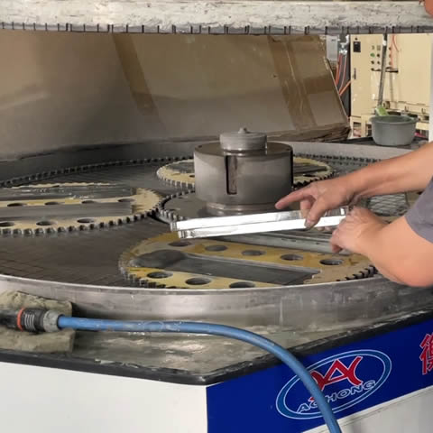 我们的生产流程分为九个步骤:玻璃棒原材料下料、玻璃坯料压制、减薄、倒角、双面研磨、双面或单面抛光、清洗、钢化,最后是印刷和包装。